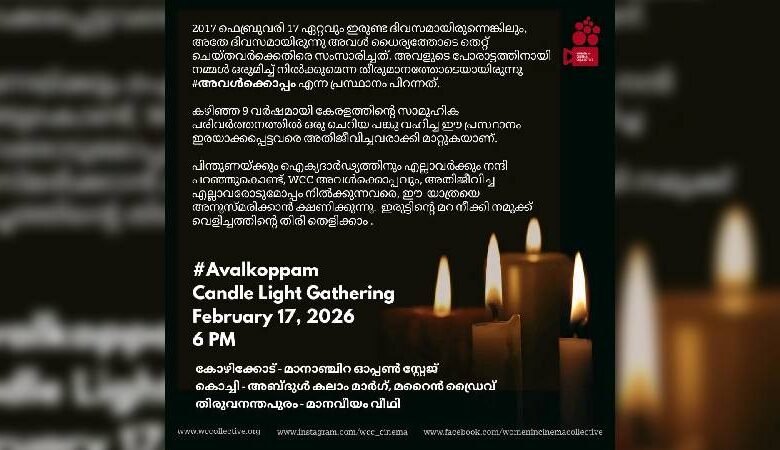 നടി ആക്രമിക്കപ്പെട്ട സംഭവത്തിന് ഒൻപത് വർഷം തികയുന്ന പശ്ചാത്തലത്തിൽ, അതിജീവിതയ്ക്ക് ഐക്യദാർഢ്യം പ്രഖ്യാപിച്ച് വുമൺ ഇൻ സിനിമ കളക്ടീവ് (WCC) വീണ്ടും ‘അവൾക്കൊപ്പം’ കാമ്പയിനുമായി രംഗത്ത്. ഇതിന്റെ ഭാഗമായി ഇന്ന് വൈകിട്ട് ആറ് മണിക്ക് തിരുവനന്തപുരം, കൊച്ചി, കോഴിക്കോട് എന്നീ നഗരങ്ങളിൽ മെഴുകുതിരി തെളിയിച്ച് ഐക്യദാർഢ്യ കൂട്ടായ്മകൾ സംഘടിപ്പിക്കും.